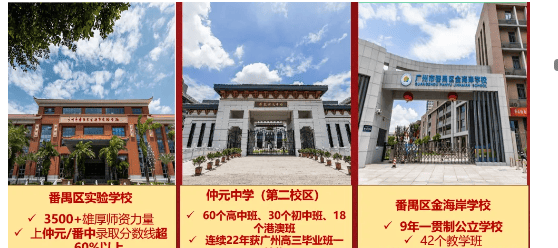 广东仲元中学(第二校区):距离项目约1.2公里,步行约15分钟可达,自驾约5分钟可达。该校规划总用地面积12万平方米,总建筑面积20万平方米,办学规模宏大,设有60个高中班、30个初中班、18个港澳班,共计108班,可提供5400个优质学位。师资力量雄厚,在职教师238人,其中省特级教师4人,正高级教师4名,高级教师129人,还有多名广州市劳动模范、南粤优秀教师、全国名班主任等,名师专家经常参与高考、中考等研讨工作。学校教学成果显著,连续二十二年获广州市高三毕业班评比一等奖,其中近十年有五年获一等奖第1名,荣获“中国百强中学”“全国体育传统项目先进学校”等多项荣誉称号,是番禺乃至广州的顶尖中学之一。