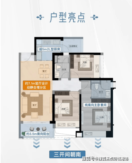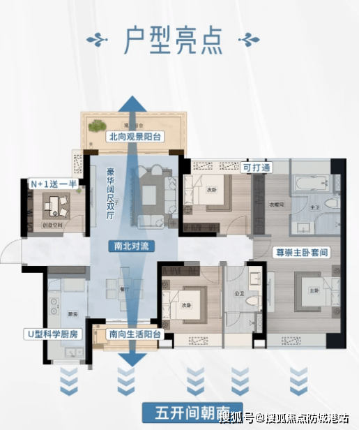 建面约138㎡南北对流大平层,作为改善型主力户型,具备多重亮点。户型采用南北双阳台设计,实现空气对流,同时北阳台可作为生活阳台晾晒衣物,南阳台可作为景观阳台欣赏滨江与园林美景,功能分区明确。5开间朝南的设计让室内采光充足,每个房间都能享受阳光照射,告别阴暗潮湿。