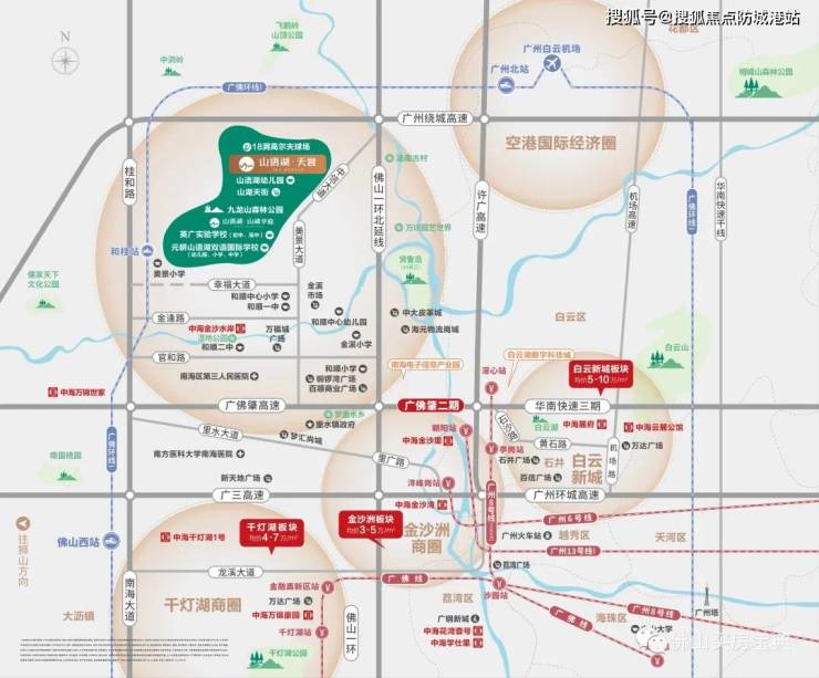 中海山语湖天誉位于广佛交界——白云西里水板块,处于新白云机场、广州市中心和佛山市中心的三角几何中心,地块四周路网发达。项目是由中海地产与保利达集团合营开发,是里湖新城板块的十年醇熟大盘。