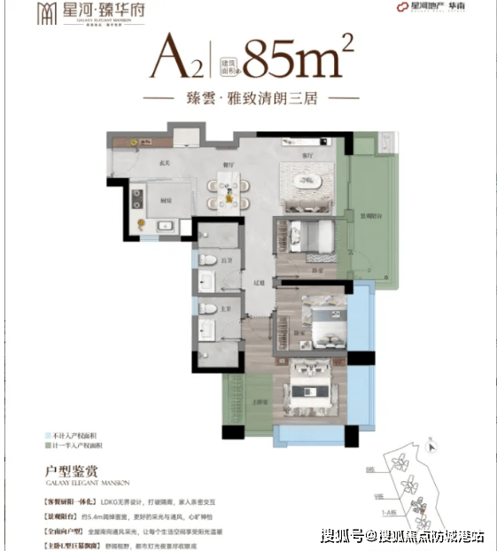 85㎡三房两卫:实际使用面积等同于传统 95㎡户型,主卧带 270° 飘窗,采光通风极佳,紧凑却不局促,刚需上车门槛极低;