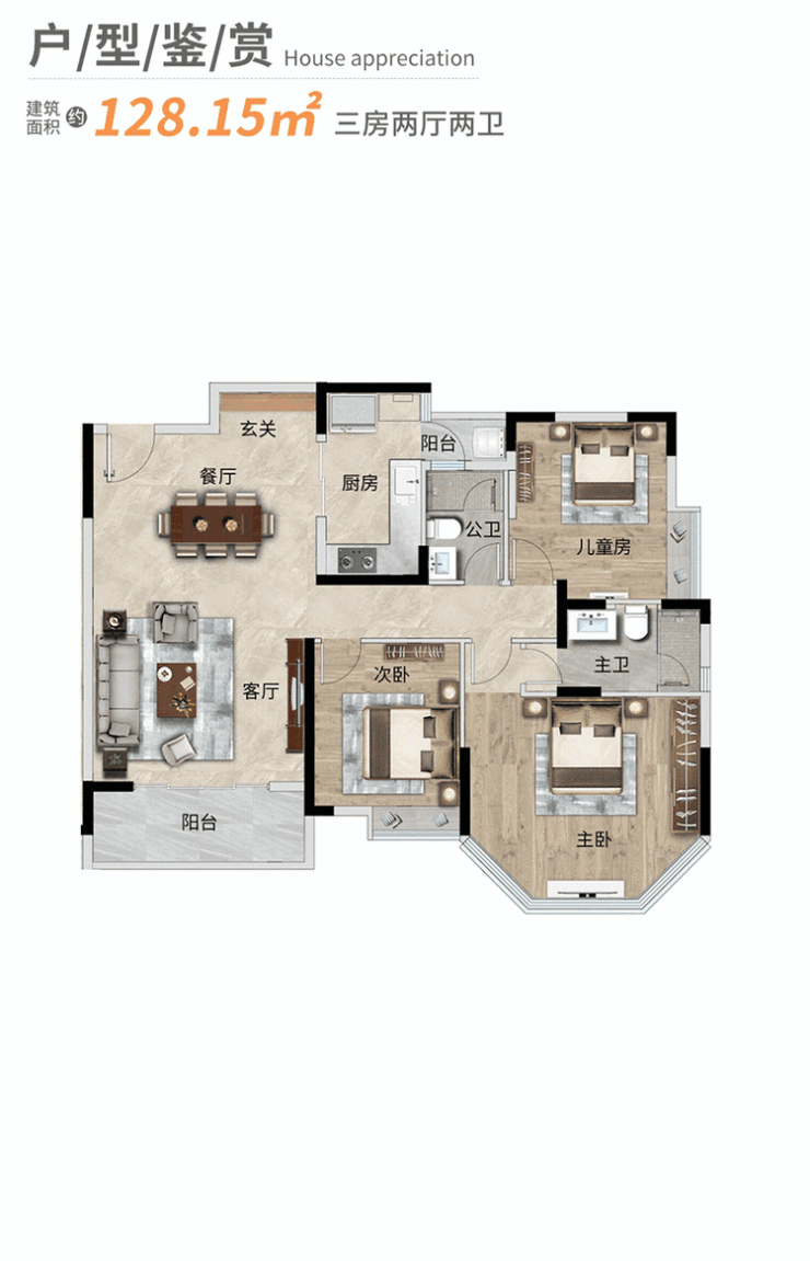 128㎡:三房两厅两卫