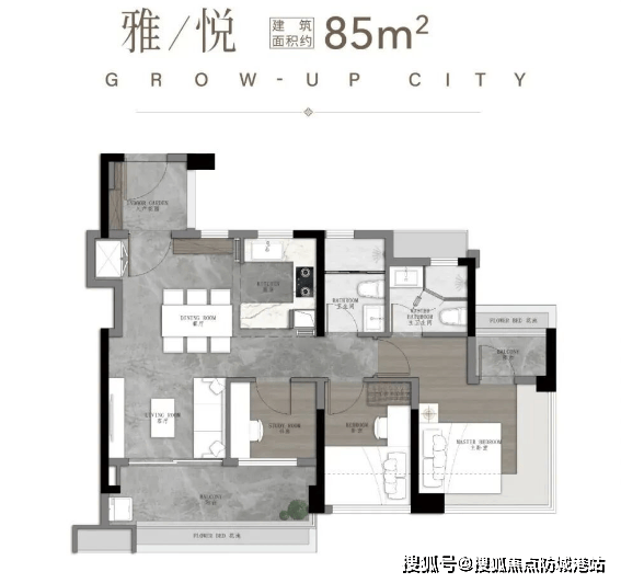 三房两厅两卫布局,四开间朝南,全明转角玄关,开放式厨房,开阔景观阳台。