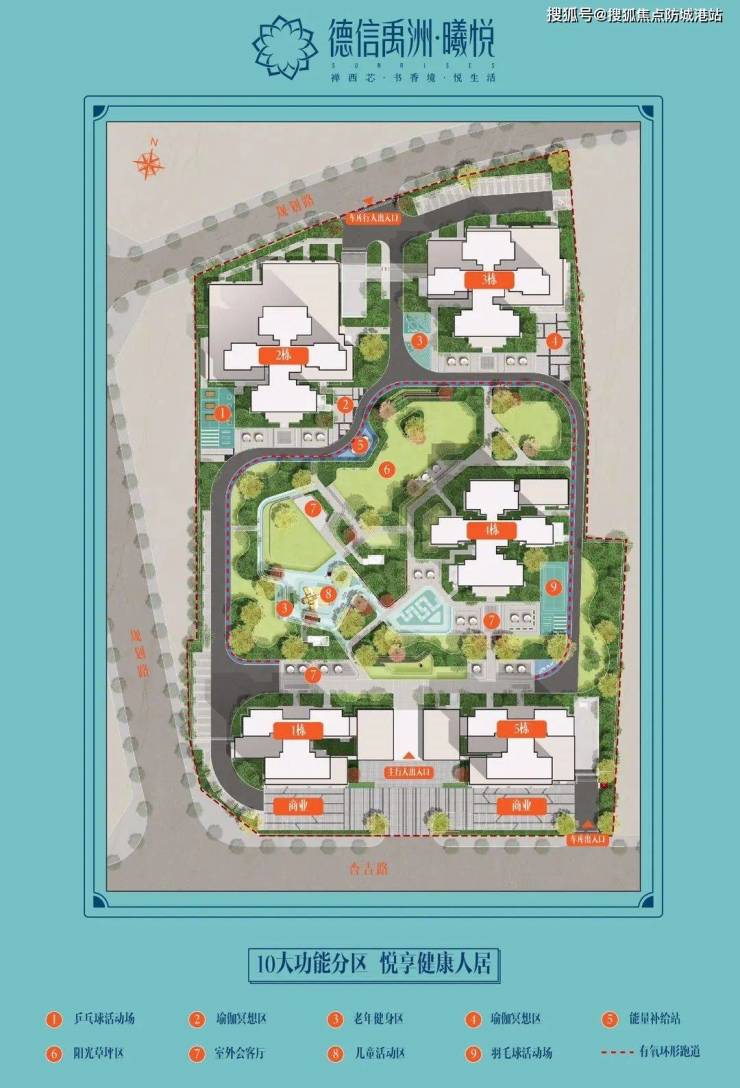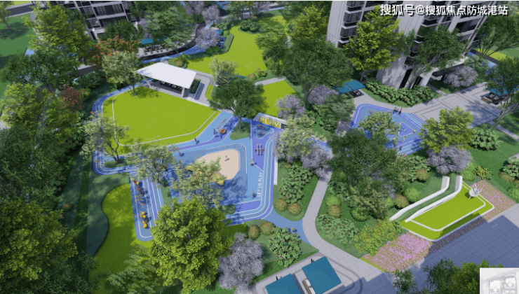 粤上水乡园林:从大区入口到入户前厅一线设置多主题绿化景观,给予居住者步移景异的观景体验。设置老年健身区、青年瑜伽冥想区、儿童游乐区、乒乓球场、羽毛球场、邻里休息区、室外会客区、萌宠乐园、有氧环型跑道等全龄化健身设施。