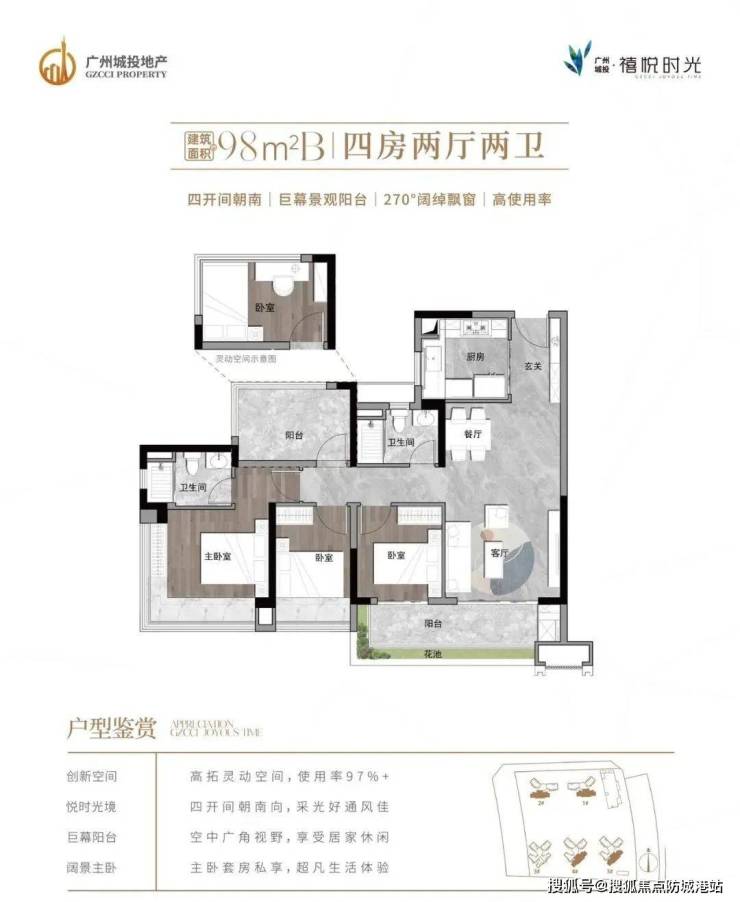 全屋超实用大开间设计,打造四开间朝南+奢阔景观阳台+大尺度飘窗+高拓展空间,让生活大有“享”法,户户主卧带270°巨幕飘窗,日常起居尊享超广角风光。