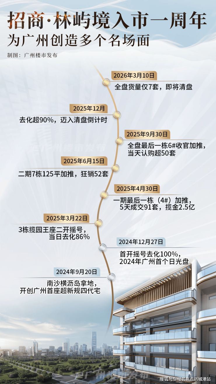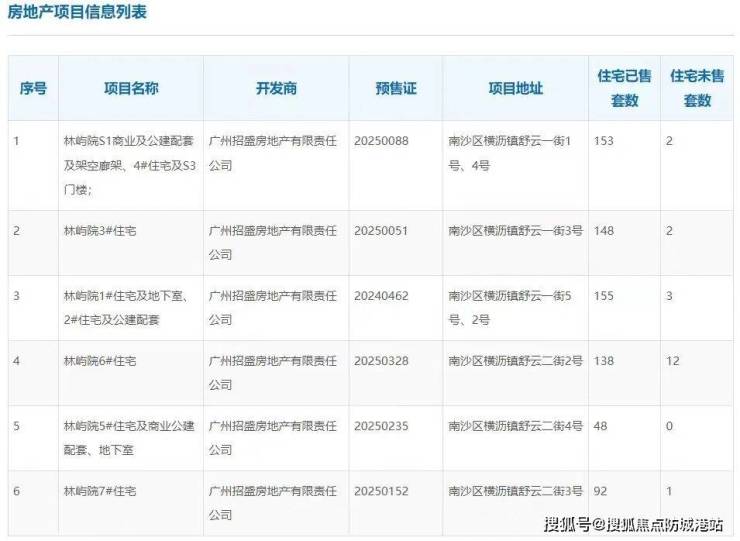 接下来给大家看我们项目的真实销售数据,绝对没有任何夸大,全部来自官方备案平台。根据广州市住房和城乡建设局官网、阳光家缘网数据显示,截至2026年3月13日,招商林屿境项目累计网签了737套住宅,全盘住宅总套数为754套,网签率高达97%,剩下的房源掰着手指头都能数得过来,截至2026年4月18日,项目可售住宅房源已不足10套,真正进入了清盘收官阶段。很多朋友可能不知道,这个成绩在当下的广州楼市有多难得,克而瑞好房点评网的数据显示,2025年广州南沙区全年成交的项目中,招商林屿境拿下了成交套数、成交面积、成交金额三冠王,从2024年12月首次开盘,千人摇号去化接近100%,成为当年广州难得一见的日光盘,之后更是五开五爆,一年多的时间就几乎完成清盘,这样的去化速度,全广州都找不出几个。很多中介会拿我们项目的销量做文章,给大家推虚假的工抵房、内部房源,其实都是套路,我们项目所有房源均由开发商直营销售,没有和任何中介合作,大家一定要认准官方渠道。大家如果想了解项目最新的剩余房源情况,可以直接拨打招商林屿境售楼处电话400-050-8083,获取实时的房源销控表,所有信息真实同步,无中介虚假宣传。本段落所有数据均可通过广州市住房和城乡建设局官网核验,大家是不是没想到这个盘卖得这么快?