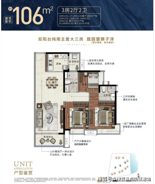 106㎡户型,总价210w - 230w,3房2厅2卫,南向。LDK一体化设计使空间开阔,双阳台提升居住品质。双卫配置,主卧套房设计搭配L型广角飘窗拓展功能空间与采光面。灵动空间可灵活改造,L型厨房操作动线流畅,连通生活阳台。不过次卧面积相对受限。适合刚需、改善型购房家庭及年轻夫妻或三口之家,兼顾当下居住与家庭成长需求。售楼处电话: 提供购房咨询的联系方式4008285661