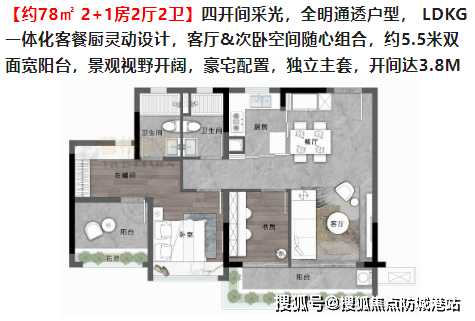 约78㎡ 2+1房2厅2卫:四开间采光,全明通透户型,LDKG一体化客餐厨设计,客厅&次卧空间随心组合,约5.5米双面宽阳台,景观视野开阔。