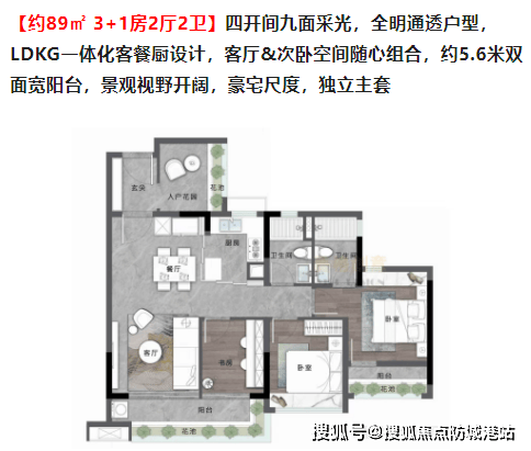 约89㎡ 3+1房2厅2卫:四开间九面采光,全明通透户型,LDKG一体化客餐厨设计,客厅&次卧空间随心组合,约5.6米双面宽阳台,景观视野开阔。
