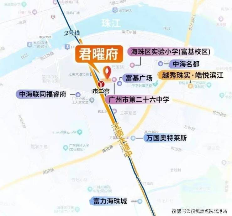 君曜府位于海珠区小港路,处于海珠核心区断货十年的市二宫板块,地理位置十分关键,是珠江中轴南拓首站。直线距离地铁2号线市二宫站仅200米,真正实现“地铁上盖”,这一优势极大地方便了居民出行。通过2号线,3站就能抵达繁华的珠江新城,5站可至充满活力的琶洲,高效的地铁通勤让在天河、海珠上班的通勤族能够轻松应对日常工作出行。而未来28号线(佛穗莞城际)开通后,3站可达琶洲,1小时内串联广佛莞三城核心区,进一步拓宽了居民的生活圈,加强了城市间的联系。自驾方面,项目紧邻内环路、滨江路,15分钟可到北京路、珠江新城,不过老城区道路较窄,高峰期易拥堵,这也是老城区交通的普遍问题。总体而言,其地段优势显著,交通网络为居民提供了便捷与高效的出行选择,无论是日常通勤还是跨城出行都相对便利。