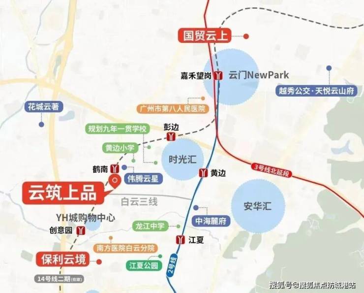 交通路网呈“双地铁+三纵三横”布局:距在建14号线鹤南站A出口约200米,该线路二期(嘉禾望岗-广州火车站)2024年8月土建进度62%,预计2025年建成通车;距2号线黄边站约1公里,现有公交线路831路、804路直达社区门口。自驾经华南快速、空港大道,35分钟可达天河CBD,25分钟接驳白云机场。板块内规划有云城西路北延线,建成后将实现与白云新城核心区5分钟互通。