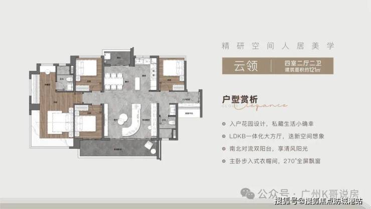 · 121㎡四房两卫:采用横厅设计,餐厅与阳台贯通,主卧配备270°无柱飘窗,视野无遮挡;