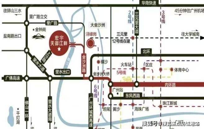 地铁:虽然距离现成最近的广州地铁 6 号线和 12 号线交汇的浔峰岗站导航距离 6 公里左右,步行较远,但地铁可直达广州市区,借助其他交通工具转乘地铁后,能方便快捷地到达广州各繁华区域,满足居民前往广州工作、购物、娱乐等需求。