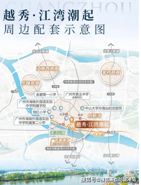 越秀江湾潮起紧邻珠江后航道,拥有丰富的江景资源。步行约300米即可到达1.7万平方米的滨江公园,享受自然美景。此外,广百海港汇已于2023年12月封顶,计划于今年底正式开业,集商务办公、休闲购物、酒店于一体,为居民提供了便捷的生活配套。