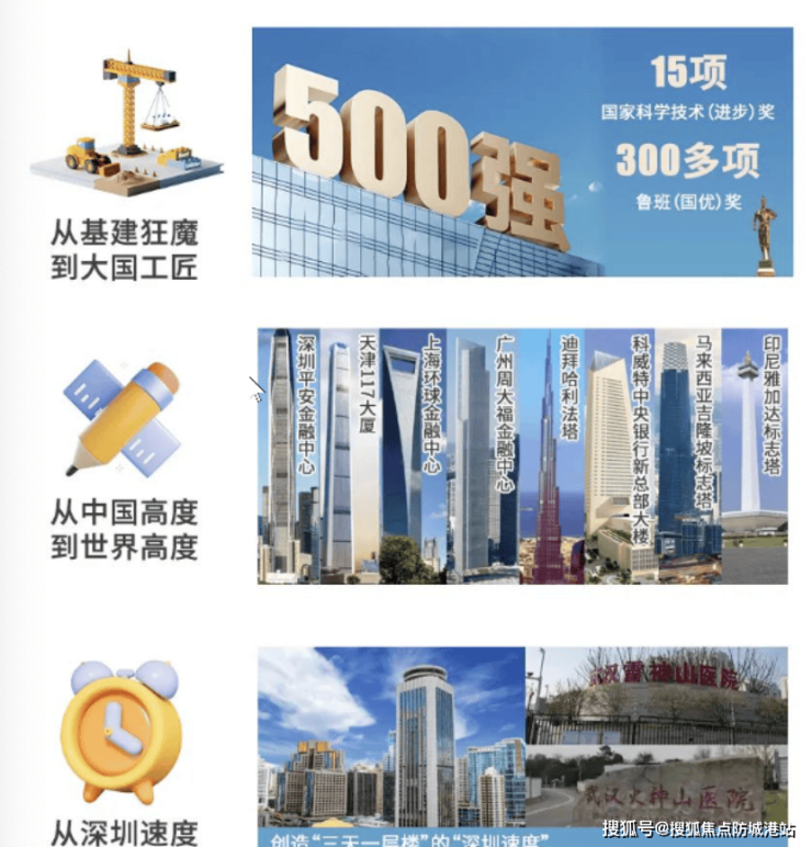 荣誉资质:累计 15 项国家科技进步奖、300 + 项鲁班奖(国优),建筑品质全球公认。
