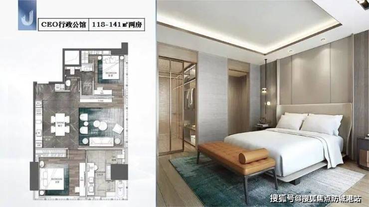 CEO行政公馆:面积为118至141平方米,两房设计,既保证了居住的舒适性,又不失豪华感。