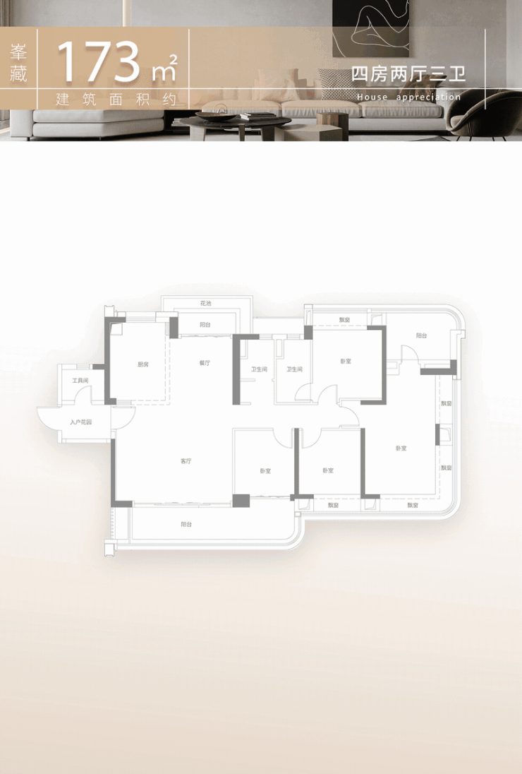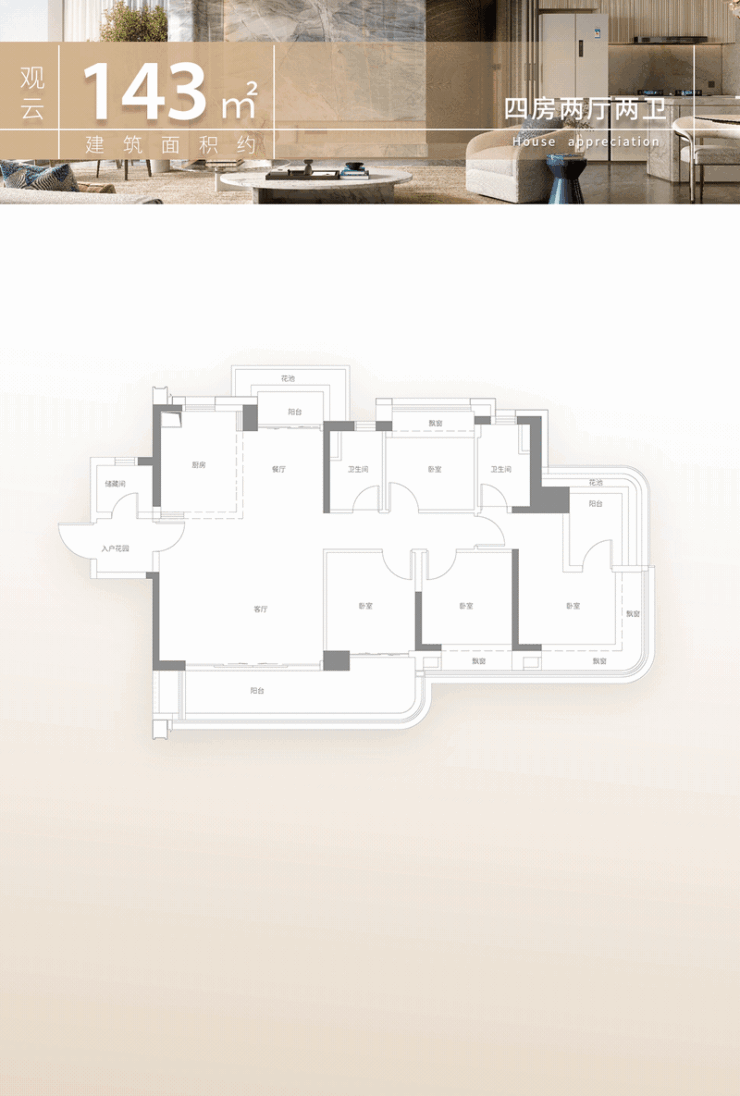 在房地产新政背景下,中建·白云之星的产品力核心集中体现在其对“新规”红利的极致运用上,实现了部分户型使用率超过100%的技术突破。以建面约128平方米的四房户型为例,该户型设计了步入式独立玄关,有效隔绝了室外灰尘与视线干扰;客厅开间达到约5.3米,连接着一个约8米宽的弧形阳台,这种大面宽短进深的格局极大地提升了室内的采光面与通风效率。主卧配备了270°的弧形转角飘窗,将原本属于结构面积的空間转化为可使用的景观延伸区。再看建面约143平方米的四房户型,其创新之处在于“LDKG+X”的宽厅概念,即客厅、餐厅、厨房与家政区的一体化融合,并额外增加了一个多功能“X”空间,可根据家庭需求灵活定义为书房、茶室或儿童游戏区。该户型拥有南北双阳台,实现了真正的南北对流,三面无遮挡的布局保证了每一主要功能间都有自然光线注入;约20平方米的主卧套房内,甚至预留了设置独立衣帽间的尺寸条件。针对多代同堂的家庭,建面约173平方米的户型采用了双套间设计,除了常规的LDKG+X布局与中西双厨配置外,还设置了独立中岛台,增强了家庭社交属性。主卧面积升级至约31平方米,配备了约1.5米宽的独立浴缸,达到了行政套房的舒适度标准。而位于3号楼的建面约226平方米终极改善户型,则完全按照私梯入户的标准打造,两梯两户的板式结构确保了极高的私密性。其LDKG+X超级聚厅包含了豪华客厅、中西双厨以及可容纳大型圆桌的约13.5平方米餐厅,外接约10.8米长的跑道级阳台。四个卧室中特别设置了双重南向套房,通过分区布局照顾老人与年轻人的作息差异,实现“合而不扰”。主卧面积高达约36平方米,配备约1.7米宽浴缸及美妆冰箱等细节设施,全屋交付标准涵盖国际一线品牌建材,并预装了华为鸿蒙智能系统,支持AI跌倒监测、门窗智能电控等场景化应用,展现了其在智能化人居方面的探索。