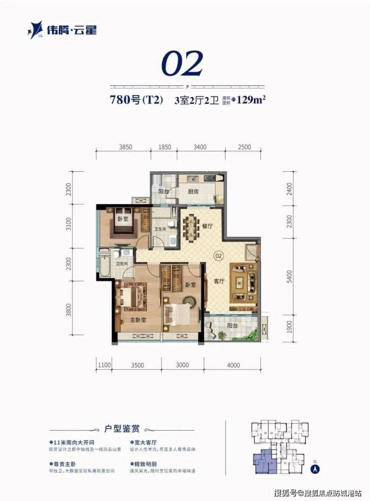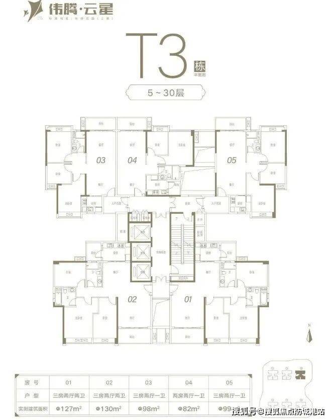 伟腾云星推出的压轴楼王T3栋共有130套房源,户型面积从约82㎡至131㎡不等,涵盖二房到三房的选择。每个户型都南北对流,带有入户花园,方正实用,赠送面积多,超宽楼距,前后无遮挡,让住户可以独享白云山的壮丽景色。