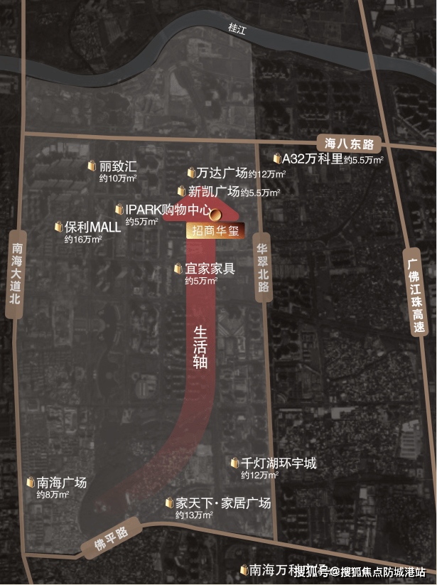 招商华玺所处的千灯湖片区,坐拥佛山最成熟、最繁华的生活配套。周边商圈聚集力强,桂澜路上分布有南海万达、保利水城、怡丰城、千灯湖环宇城等大型商超,商业体量超过280万平方米,构筑佛山一站式高端消费生态。教育方面,项目周边聚集了南海外国语、桂江小学、桂城中学等品牌学府,涵盖从幼儿园到高中的一体化优质教育资源。医疗配套亦不逊色,临近佛山市南海区人民医院、广佛国际医院等重点医疗机构,保障全家健康生活。