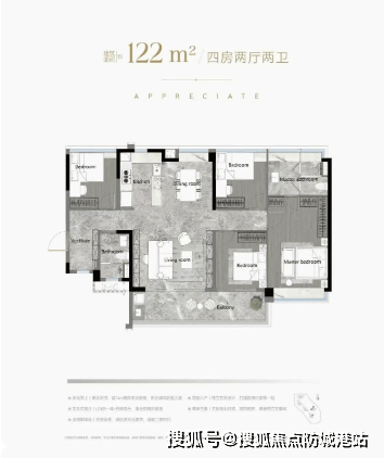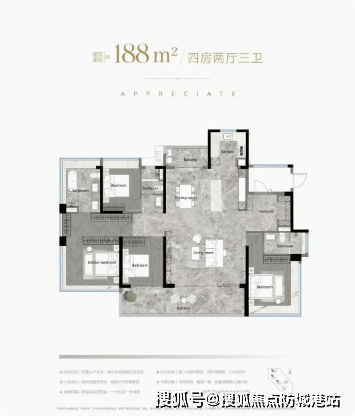 南向阔景四房: 建筑面积约为103-188平方米的南向阔景四房户型,每户均享有无遮挡阔景视野,通风采光俱佳。