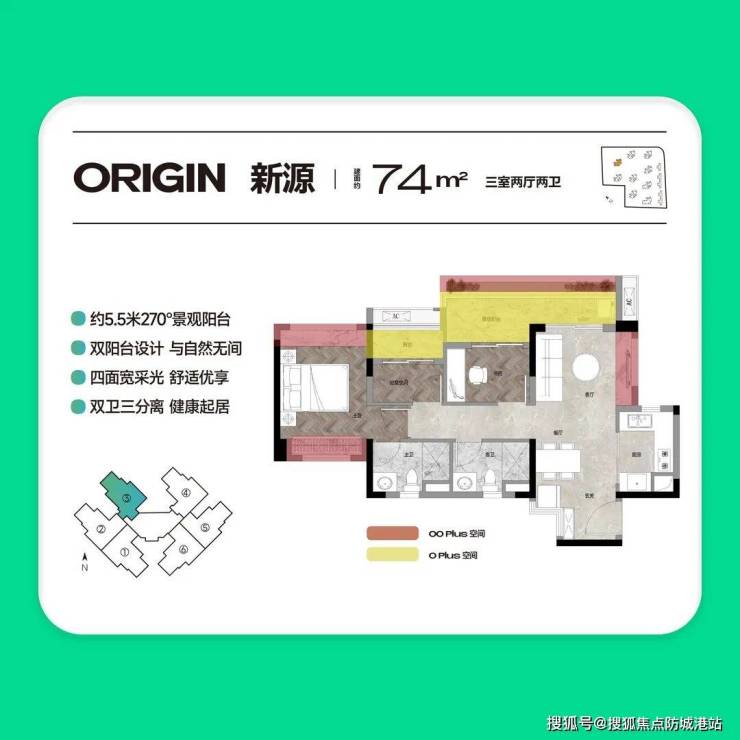 约74㎡/76㎡ 3房2厅2卫:紧凑实用,适合年轻家庭,每户均配有5.5米大阳台,采光充足。