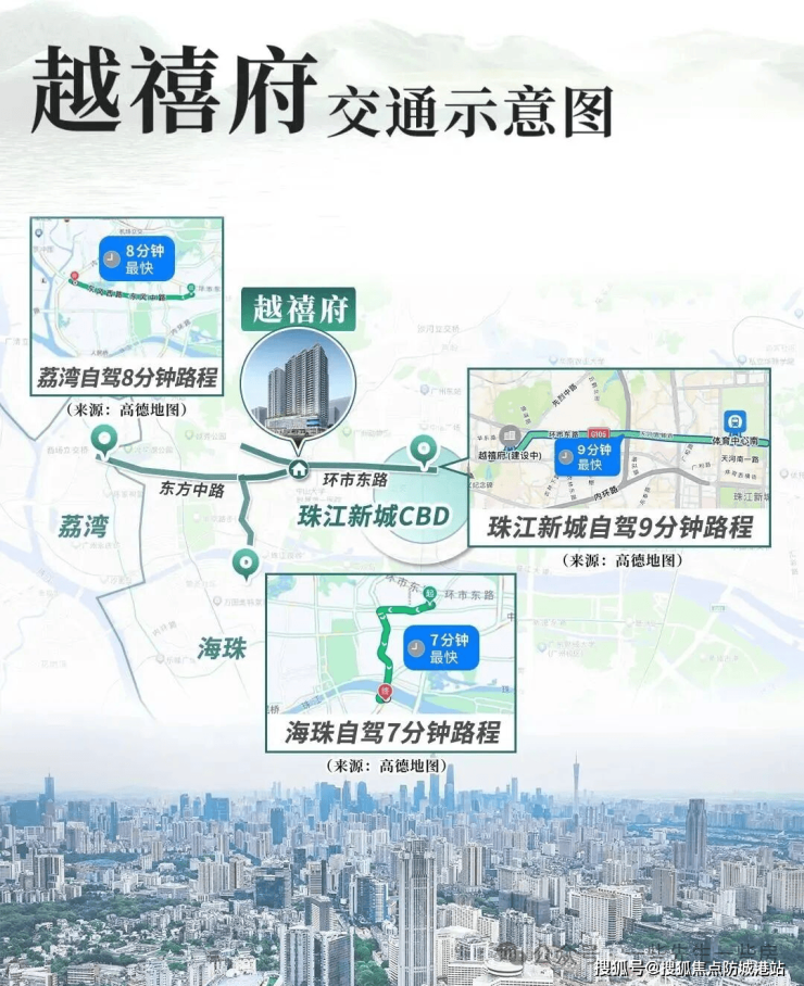 项目周边环市东路、东濠涌高架、东风东路三大主干道环绕,形成“三横三纵”的交通网络。驾车10分钟可达天河体育中心,15分钟可达海珠江南西,早高峰通勤效率在广州TOP级。同时,项目周边设有多个停车场,方便业主停车。