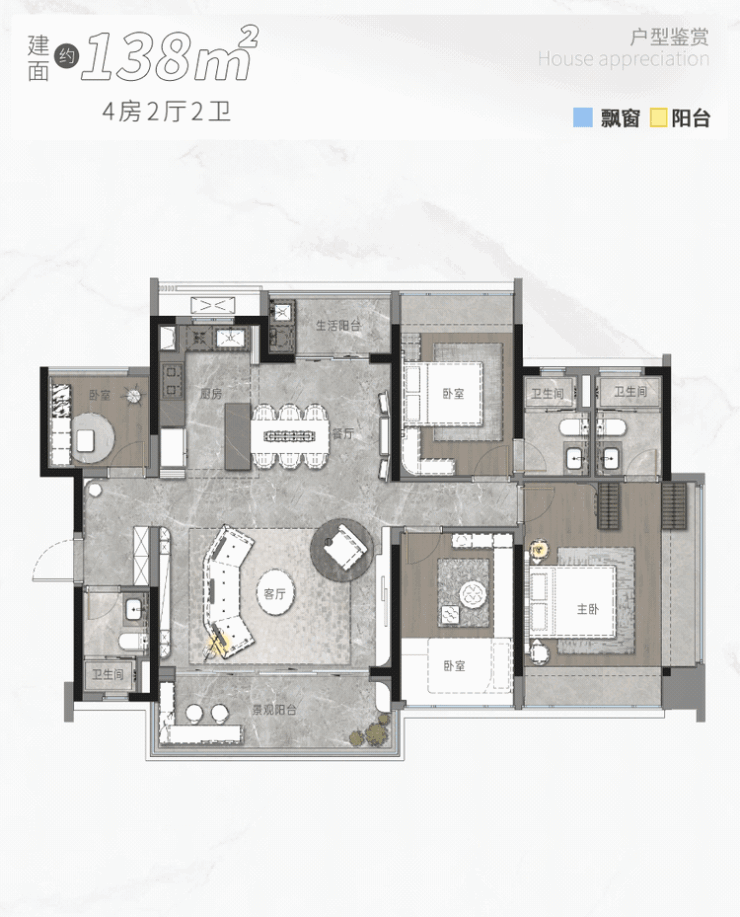 建面约138㎡4房户型,无论是南向的舒适度、还是各个空间的奢阔程度,都是顶级享受。不到140㎡就能做到双主套设计,让两代人居住“合而不扰”,仅凭此就能吊打很多市面上同等面积的产品。