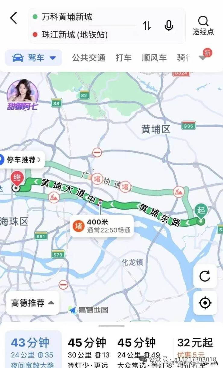 到珠江新城:全程 24 公里,耗时 43 分钟,打车约 32 元