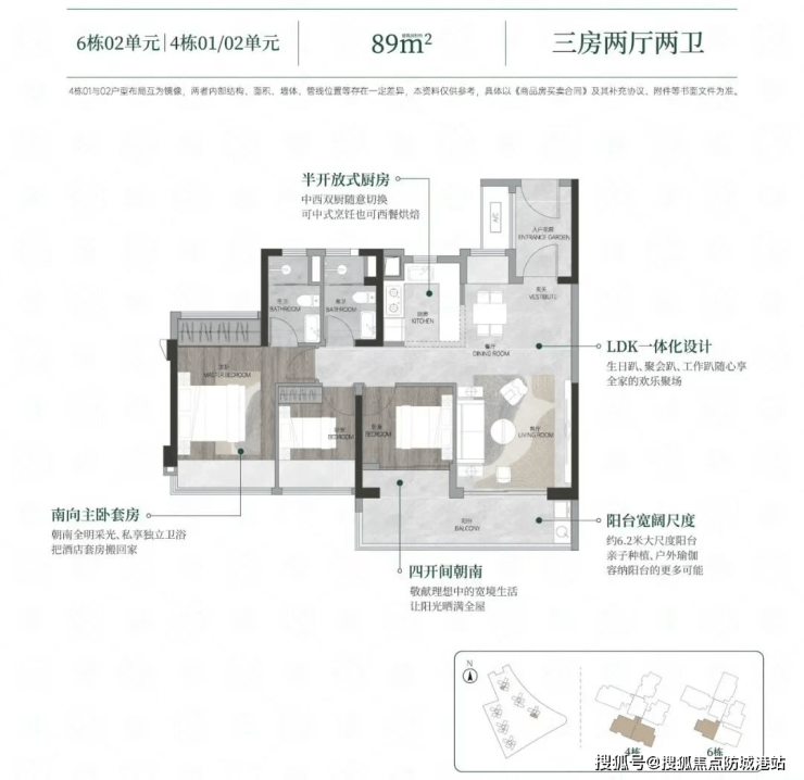 89㎡四房两厅两卫:项目爆款户型,得房率 105%,实测使用面积 93.45㎡,89㎡实现四房设计,性价比极高。双卫生间设计,满足多人口家庭使用需求;主卧带独立卫浴及衣帽间,私密性强;南向阳台面宽 4.2 米,视野开阔,可欣赏社区园林美景。