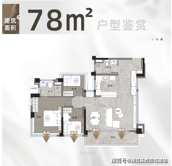 建面约 78㎡三房两卫:使用率 115%-121%,实际使用面积约 90-95㎡,超越周边项目 99㎡户型的使用空间,刚需预算即可享受三房两卫的改善级居住体验;