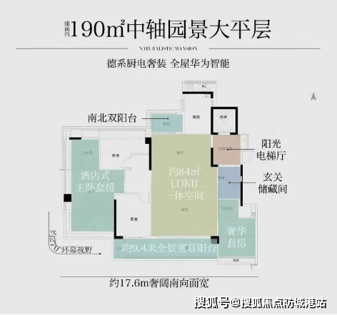 四开间朝南:拥有约9.4米宽幕阳台,主卧面积超43平米,270°环幕飘窗,LDKG一体化公区设计,空间通透感强。