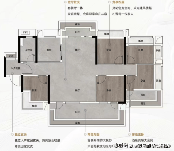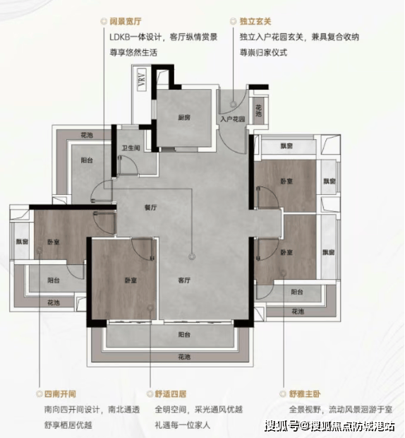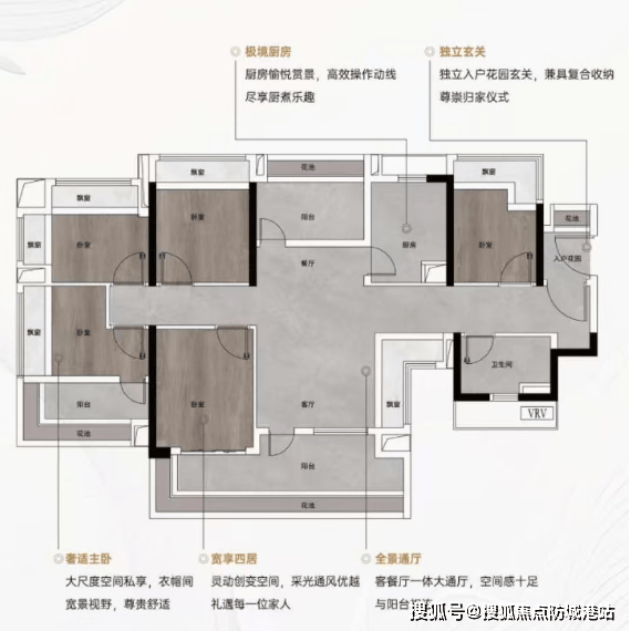 建面约115-116㎡南北对流四房:四开间甚至4.5开间朝南,南面宽阳台设计加上花池赠送,空间阔绰。北面餐厅预留花池位置,可做餐边柜形成对流。主卧L型花池设计,景观面大且不占室内面积,实用性极强。