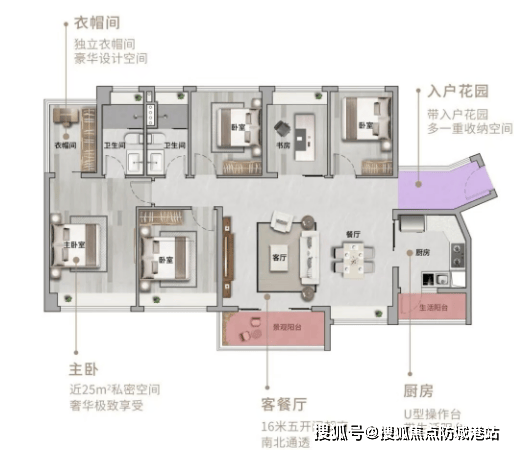 119㎡四房+1厅2卫:单边位布局,南向开间宽大,南北通透。