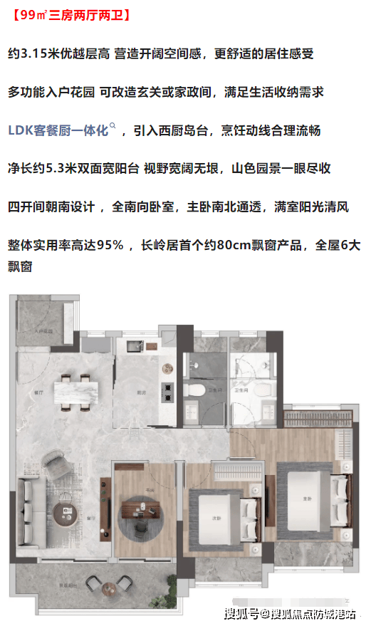 优质层高:各户型层高分别为3.15米和3.3米,提供了更为开阔的空间感。