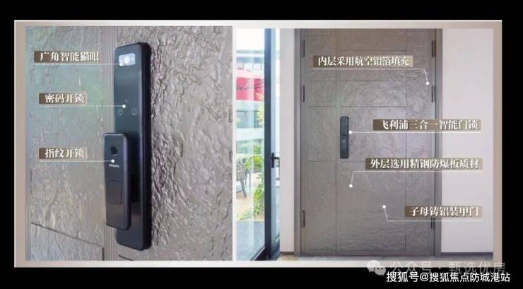 Part 4精装价值【子母铸铝装甲门 智能门锁构建安全堡垒】入户门内层航空铝箔填充,隔绝外界噪音干扰;外层精钢防爆板质材,具备超强耐用性及稳定性;飞利浦三合一智能门锁,广角智能猫眼/密码/指纹等多重功能,护航家族居家安全。
