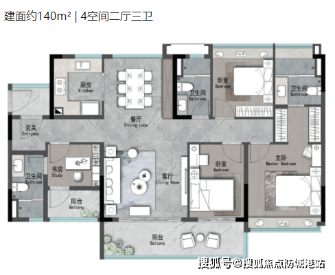 建面约140平方米:四房两厅三卫,宽敞明亮,为大型家庭提供了充足的生活空间。