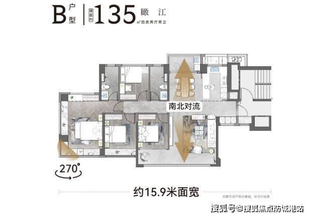 135㎡的 B 户型同样以其出色的采光和独特的设计吸引眼球。四开间朝南,南向面宽达到 15.8 米,使得室内空间通透明亮。南北对流双阳台设计,不仅增强了空气流通,让室内保持清新,还营造出宽敞的空间感。