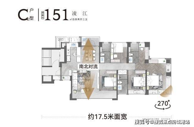 C2 户型与 C1 户型有相似的核心亮点,又独具特色。独立玄关入户,增加了空间的私密性和仪式感。同样是南北对流双阳台设计,4.5 开间朝南,南向面宽达到 17.45 米,保证了充足的采光和良好的通风。