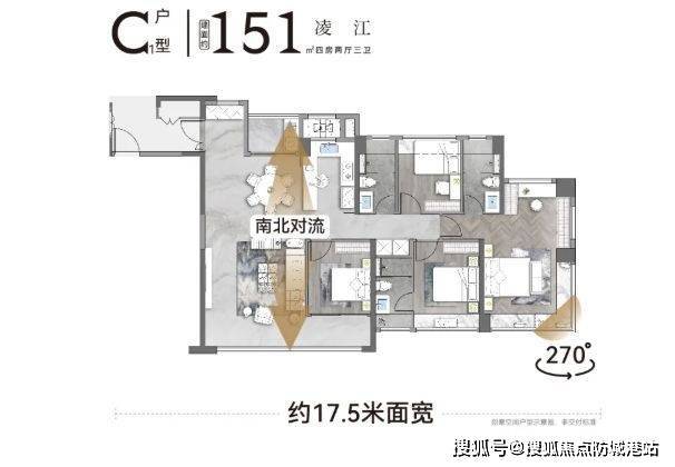 C1 户型为追求宽敞居住空间和高品质生活的家庭提供了理想选择。4.5 开间朝南,南向面宽超过 17 米,保证了充足的采光和通风,让室内始终保持明亮和舒适。南北对流双阳台设计,进一步提升了空气流通,同时景观阳台连通次卧,增加了空间的通透感和休闲功能。