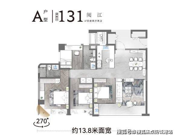 对于追求舒适居住体验且注重采光的家庭来说,131㎡的 A 户型是个不错的选择。四开间朝南的设计,使得南向采光面达到 13.4 米,让阳光能够充分洒入室内,营造出明亮温暖的居住氛围。景观阳台连通次卧,面宽达到 6.5 米,不仅增加了室内的通透感,还为住户提供了宽敞的休闲空间,可在此欣赏江景或社区园林景观,享受惬意时光。
