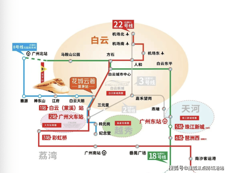 公交珠实·花城云著的交通优势,堪称广州北部乃至全市的典范。项目距离地铁22号线北延段及8号线北延段支线夏茅站仅约50米,完全就是在家门口,是真正的“双地铁上盖”物业。这种零距离的接驳,让业主的出行变得无比便捷,真正实现了“出门即地铁”的梦想。22号线北延段被誉为广州南北大动脉,时速高达160公里,贯穿空港、白云棠溪、广州火车站、南站等7大枢纽,全线换乘高达16处之多,无缝接轨广州全市。乘坐22号线北延线,仅需1站即可到达白云站,2站直达越秀区,3站抵达老荔湾,若换乘18号线,5站便可直达珠江新城(冼村)。这种极速通勤体验,将白云湖板块与广州最核心的CBD紧密连接在一起,极大地缩短了心理与物理距离。