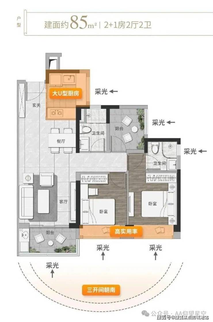 85㎡户型:通常为三房两厅一卫或两卫设计,空间布局紧凑实用,功能分区明确。适合年轻夫妇或小家庭,既能满足基本居住需求,又控制了总价门槛。
