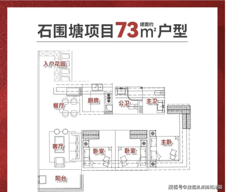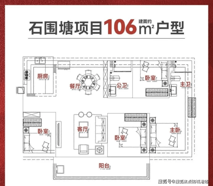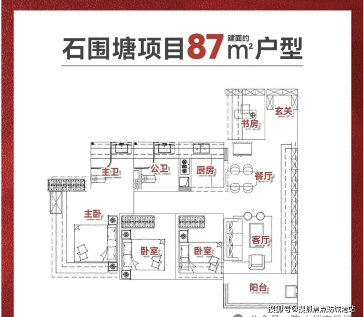 项目主推户型面积分别为77㎡三房、88㎡四房以及106㎡四房。77㎡三房带2卫设计,主卧可实现270°观景,配有衣帽间,空间布局紧凑但功能齐全;88㎡四房有竖厅和南北对流两个版本,其中南北对流版采光面更广,拥有U型采光设计,小户型中罕见;106㎡四房则以单边位设计为主,四开间朝南,阳台约7米,横跨客厅和卧室,使各房间空间宽敞,居住舒适度高。户型设计兼顾动静分区、通风采光和景观视野,满足刚需及改善型家庭多样化居住需求。