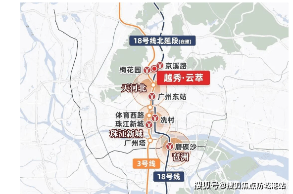 地段的价值,首先体现在与城市核心的连接效率上。越秀·云萃坐落于广州中轴之上,直线距离珠江新城仅约5公里,真正实现了“一桥之隔,直通天河”。项目周边路网发达,经由广州大道或沙太路自驾,可快速抵达珠江新城CBD、天河北等核心商务区。更为震撼的是其轨道交通配置,项目堪称真正的“双地铁”物业。家门口即是规划中的地铁18号线京溪路站,这条被誉为“地下高铁”的快线,未来将实现一线直达琶洲磨碟沙、珠江新城冼村、天河北广州东站以及番禺万博,无需任何换乘,极大缩短了通勤时间。此外,步行约800至900米即可到达现有的地铁3号线梅花园站,同样可无缝连接体育西路与珠江新城。这种“双快线”加持的交通格局,让云萃的业主能够从容掌控全城节奏,无论是日常通勤还是商务出行,都能享受头等舱般的便捷体验,彻底打破了白云区与天河区的心理界限。