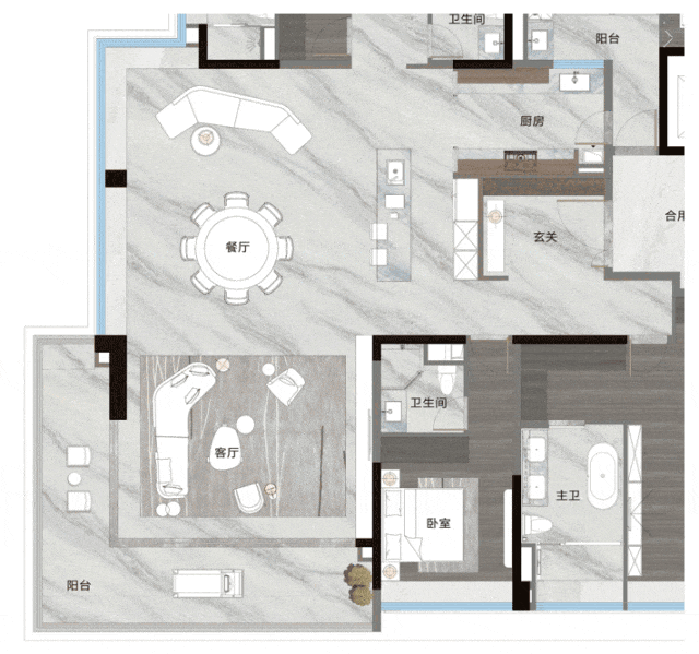 打造的LDKB开放场景式互动空间,形成以客厅为中心的交互场域,实现各个空间无界交互,增强家人互动的新生活场景: