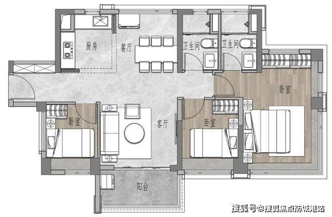 85㎡三房两卫:主卧270°转角飘窗,客餐厅一体化设计,得房率超105%;