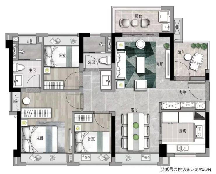 入户玄关带多功能收纳柜台,景观5开间,L型厨房,动线流畅。