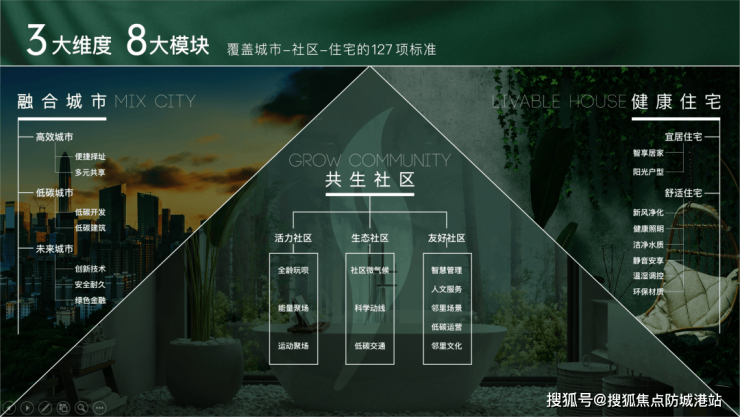 在后疫情加双碳的时代大势下,主动给“社区”和“家”赋予一个全新的定义。不仅关注绿色建筑能耗问题,更关照以人为核心的健康空间。从三大维度、八大模块进行分析设计,涵盖了127项健康技术标准。