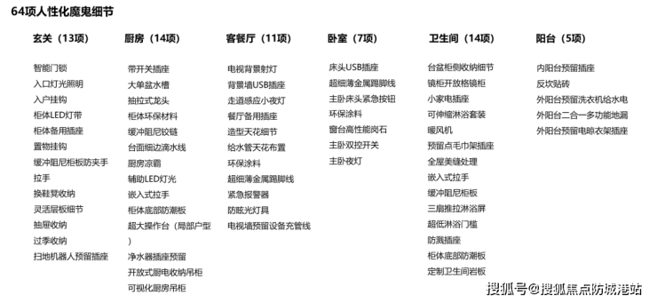 1、玄关入口设有雷达感应筒灯,解决入户照明;2、玄关柜增设扫地机器人及消毒机预留插座,增加使用功能;3、卫生间门口处设有小夜灯;4、卫生间淋浴区采用整板防滑砖设计;5、客厅卧室配以USB插座设计;6、客厅与主卧灯具采用双控设计,合理解决灯具控制;7、厨房台面插座配以开关控制,洗菜盆下方设有小厨宝及净水器插座。便于业主按照按照电器使用;8、厨房橱柜台面反边及台面滴水槽,解决台面水问题。