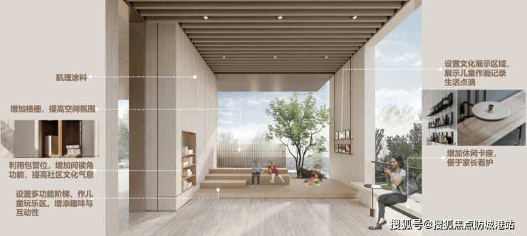 利用归家大堂打造友邻会客厅和儿童休闲区空间,为业主营造舒适的邻里交流、儿童娱乐、学习的空间,在有限的空间中提供私人“会所”般体验。