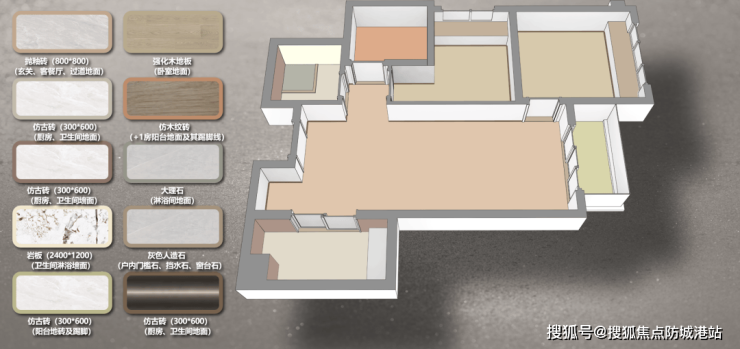 1、入户门槛石采用两级优化没计,与门开合结合设计;2、厨房吊柜白色设置,与天花白色铝扣板统一,品质感更强;3、客餐厅整本800*800MM通铺,过道做错位铺贴设计;4、客餐厅天花做暗灯槽,铝合金凹口与石膏线结合,使空间层次感更丰富;5、各空间采用人造门槛石,其中卫生间门槛石做斜坡处理;6、阳台反坎面贴瓷砖,使阳台地面与反坎更统一整洁;7、客餐厅及卫生间瓷砖、瓷片均采用同色美缝处理,提升品质感。